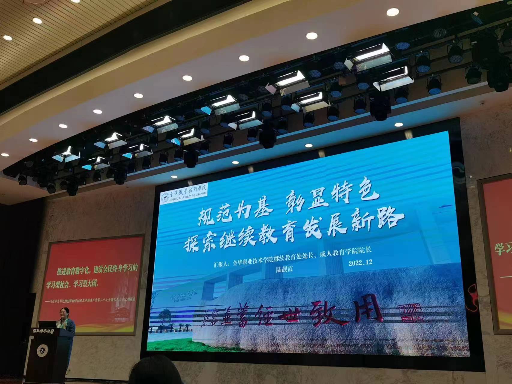 我校继续教育处负责人在会议上代表学校做发言讲话,基于学校管理体制与继续教育的办学历史,重点对当前学校的继续教育在新形势下的办学转型进行简要汇报:一是强化学历继续教育规范管理,主要通过夯实制度基础、严抓校外教学点办学规范、完善终身教育学习平台等层面守好规范底线。二是强化非学历继续教育统筹协调。发挥目标责任制考核制度抓手作用,完善校级分配与激励制度,建立并持续完善牵头分工合作机制,同时强化统筹协调与政策指导,上下形成合力驱动继续教育结构转型。此外,她还对学校今年来继续教育工作取得的成效作出简要介绍,主要体现在特色培育基础扎实、“学历+非学历”管理融合和培训品牌初步彰显三个方面,重点聚焦于培训品牌的打造、高层次培训项目的拓展等,“金职品牌”社会及兄弟院校中逐渐打响。
