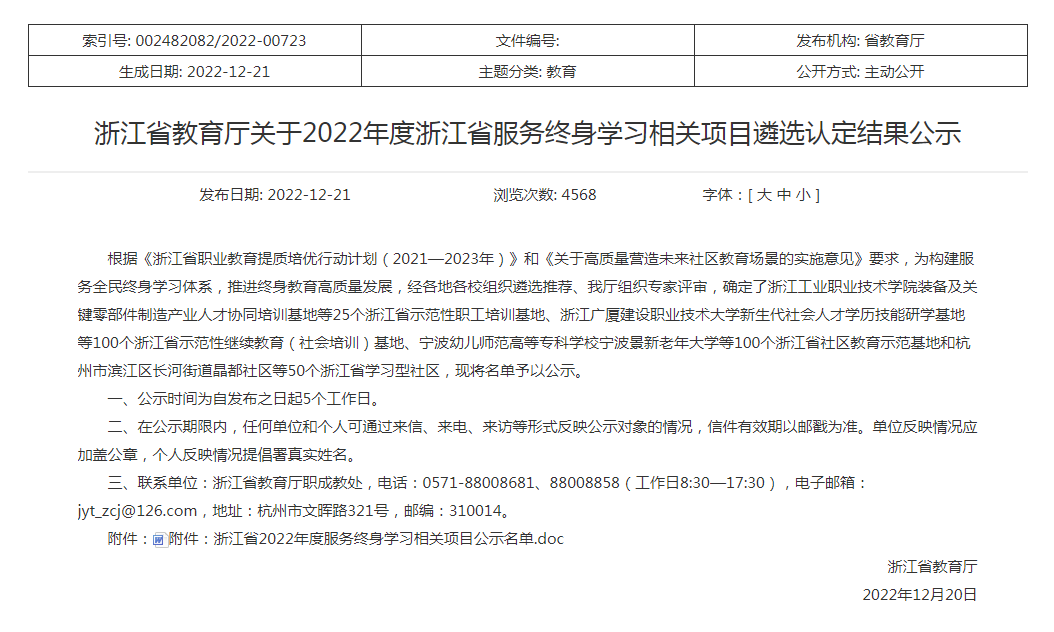 教育厅于近期发布实施《做好2022 年度服务身学习相关项目推荐申报工作的通知》,并于日前公布了“2022年浙江省服务终身学习相关项目名单的通知”(浙教办函〔2022〕410号),金华职业技术学院在众多高职院校中脱颖而出,满额申报3项并全部入选浙江省示范性职工培训基地、浙江省示范性继续教育(社会培训)基地、浙江省社区教育示范基地,并列全省第一。