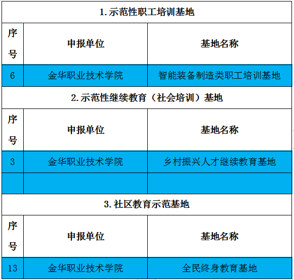 本次示范性基地评选是省教育厅为了贯彻落实《浙江省职业教育提质培优行动计划(2021—2023 年)》和《关于高质量营造未来社区教育场景的 实施意见》要求,构建服务全民终身学习体系,推进终身教育高质量发展而发起的。3类示范性基地的成功申报,是教育厅对金职院在职业培训及服务全民终身学习方面工作的充分肯定,在后续工作中,金职院将依托学校在地方及业内的影响力,致力企业职工职业技能提升、从业人员继续教育、社区居民素养提升等方面的理论研究及系列培训等工作,充分发挥基地的示范作用,为全民终身学习体系构建贡献力量。