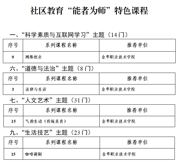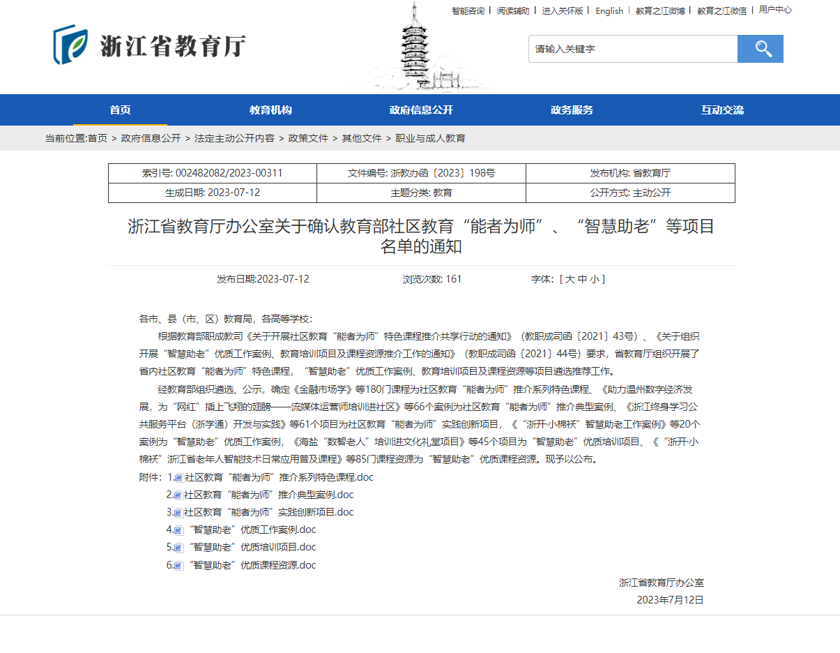 近日,浙江省教育厅发布了《关于确认教育部社区教育“能者为师”、“智慧助老”等项目名单的通知》,学校《网络课程》《法律与生活》《气韵生动》《咖啡调剂》共4门课程获评教育部首批社区教育“能者为师”特色课程。